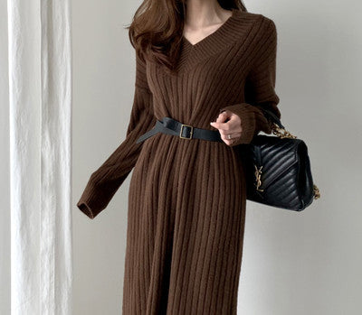 Product information: Craft: collage/splicing Style: Basic Collar type: V-neck Sleeve type: conventional sleeve Sleeve length: long sleeve Main fabric composition: Modal The content of the main fabric ingredient: 100% Color: apricot, brown Size Information: Size: L, XL, 2XL, 3XL, 4XL Packing list: Sweater skirt*1